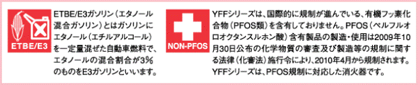 界面活性剤を主成分とし、耐アルコール性を高め、バイオエタノール(ETBE)混合ガソリン(E3)等のアルコール配合燃料火災の消火能力が飛躍的に向上。