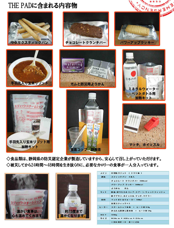- 食品類は、静岡県の防災認定企業が製造していますから、安心して召し上がっていただけます。