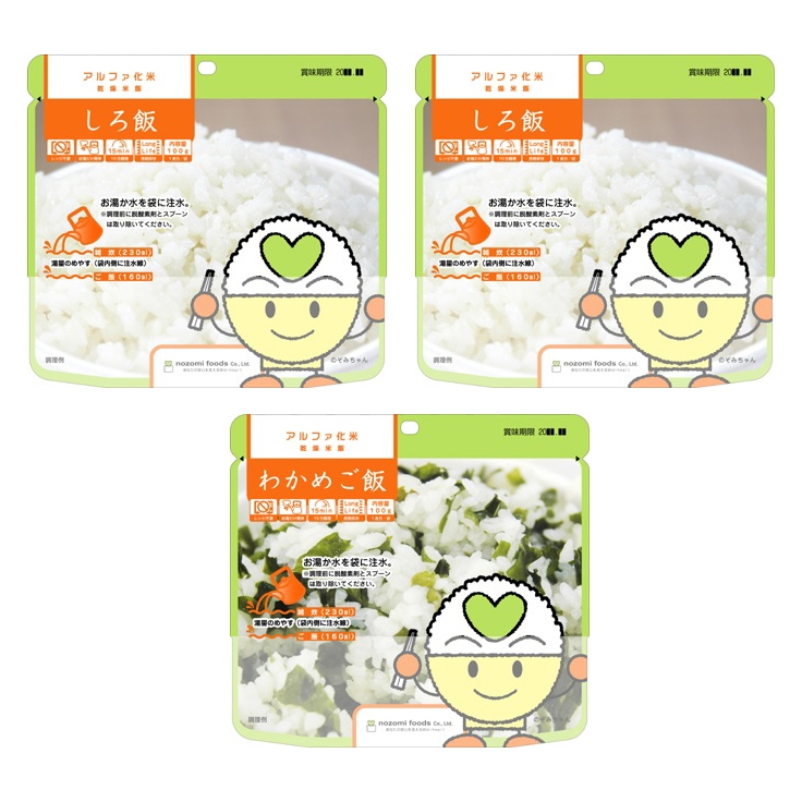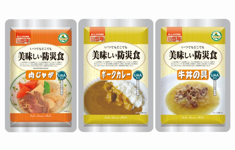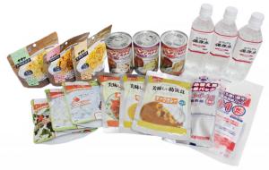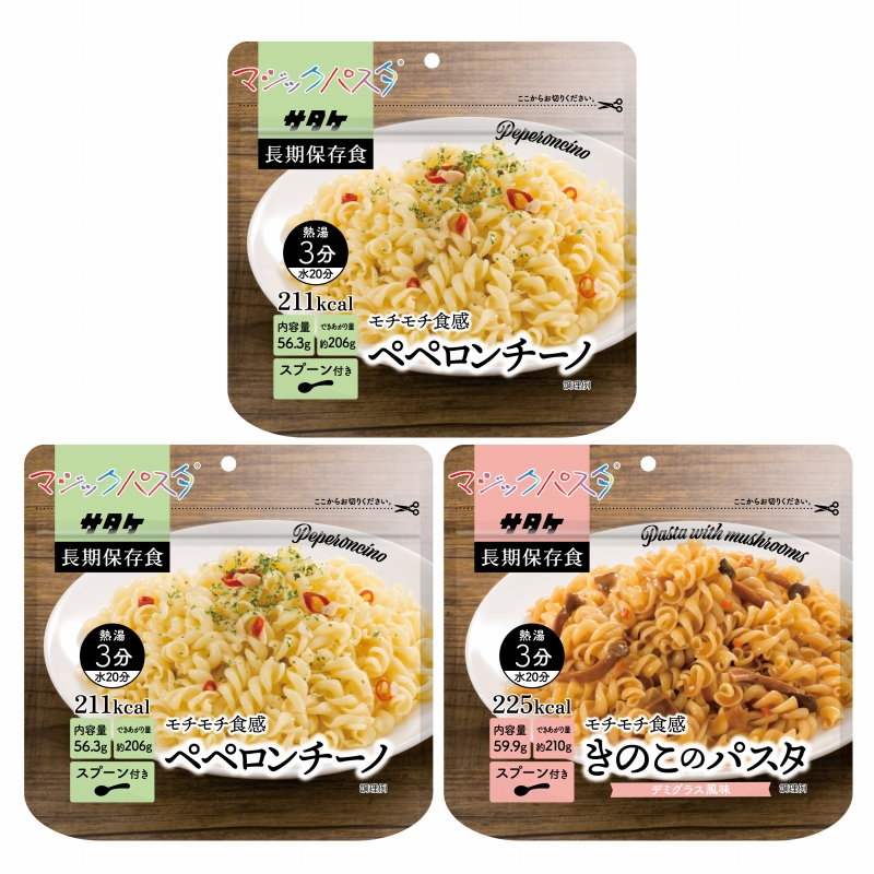 | 内容 | パンの缶詰×3缶(チョコチップ、レーズン、コーヒーナッツ)、マジックパスタ×3袋(ペペロンチーノ、カルボナーラ、きのこ)、アルファ米×3袋(白飯×2、わかめご飯×1)、美味しい防災食×3袋(肉じゃが、ポークカレー、牛丼の具)、保存水(500ml)×3本、食品加熱用パック×1セット、詰替え用加熱材(3個入)×1セット |