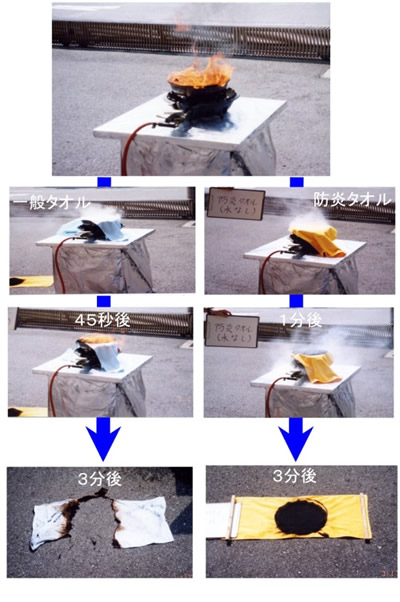 ※防炎加工タオルと一般タオルによる消火実験の結果はあくまで目安とお考えください。