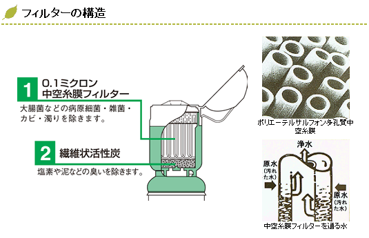 先ず、活性炭部分で比較的大きな汚れと嫌な臭いを取り除きます。繊維状活性炭を使用している為、通常の活性炭より吸着性能は大幅に優れています。次に中空糸膜フィルター部分で有害な細菌類(大腸菌、コレラ菌、サルモネラ菌など)やクリプトスポルジウム、エキノコックス、ジアルジア、カビ、濁りを取り除きます。この二重構造により、安心して飲める水ができるのです。