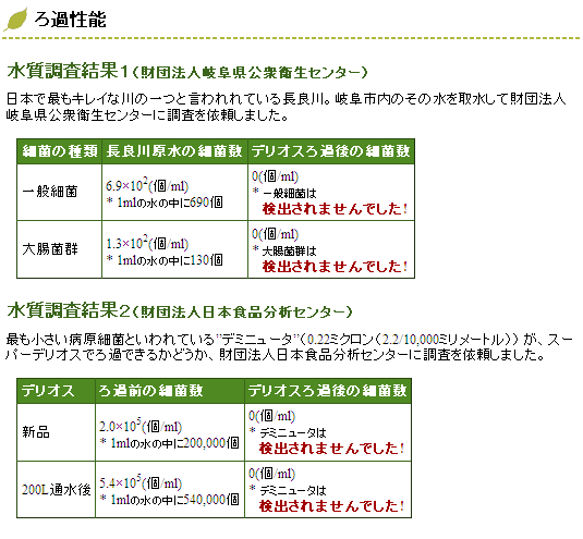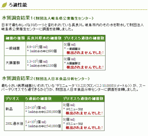 中空糸膜フィルターは、水に溶けていないもの、つまり水に分散しているものは、細菌、かびをはじめ光学顕微鏡でも見えにくい程の細かい粒子もきれいに除去します。 しかし、水に溶けている物質は、有益なミネラル分も有害な毒物もそのまま通します。 有害な有機物の一部は繊維状活性炭で吸着除去しますが、完全とはいきません。 このため、有害な物質が溶け込んでいる水は使用できません。