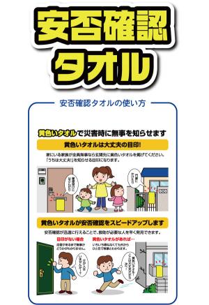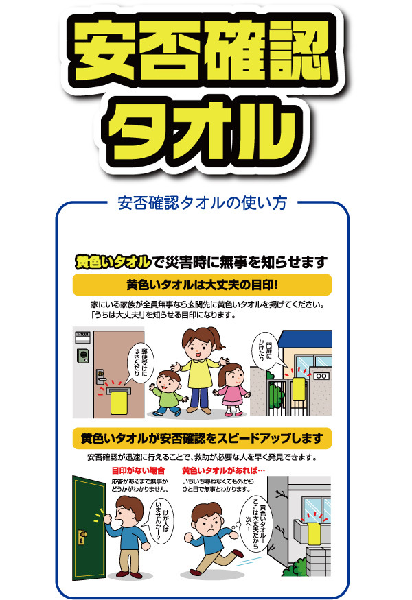 • 黄色いタオルが安否確認をスピードアップします。安否確認が迅速に行えることで、救助が必要な人を早く発見できます。