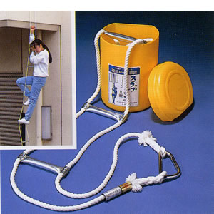 しかし、ステップダン?型はロープ2本を使用し、その中間に手掛り、足掛りを設けることによって、降下中の回転を防ぎ、確実に手足を掛けることが出来て、安全に避難することが出来ます。