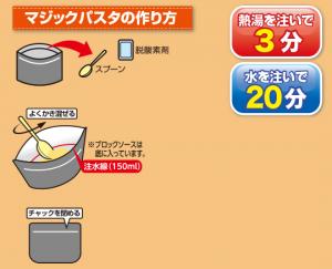 | 原材料名 | マカロニ加工品(小麦を含む)、ペペロンチーノの素[デキストリン、食塩、フライドガーリック、ポークエキス(大豆・鶏肉・りんごを含む)、その他(ごまを含む)]/調味料(アミノ酸)、増粘剤(キサンタンガム)、酸化防止剤(ビタミンE) |