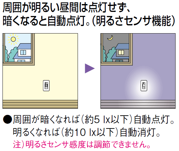 - 明るさセンサにより周囲の明るさが約5lx以上の場合人が近づいても点灯しません。