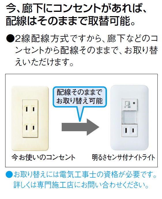 - 2線配線方式ですから、廊下などのコンセントから配線そのままで、お取り替えいただけます。