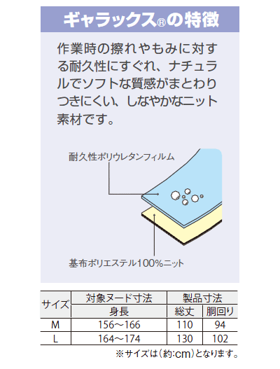 素材 基布:ポリエステル100% (ニット ギャラックスR 耐久ポリウレタンフィルム)