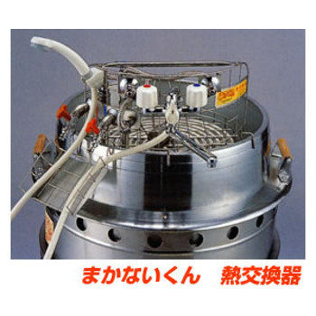 まかないくんにセットし、水道(災害時はポンプ等)の蛇口に直結することにより、かまどのお湯を効率良く熱交換して、低温〜85℃の温水を 供給します。