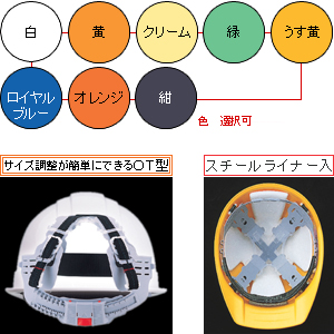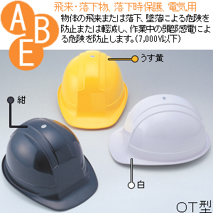 ここは空白です 補強リブつきヘルメット。飛来・落下物用+電気用+墜落時保護用。サイズ調整簡単OT型。