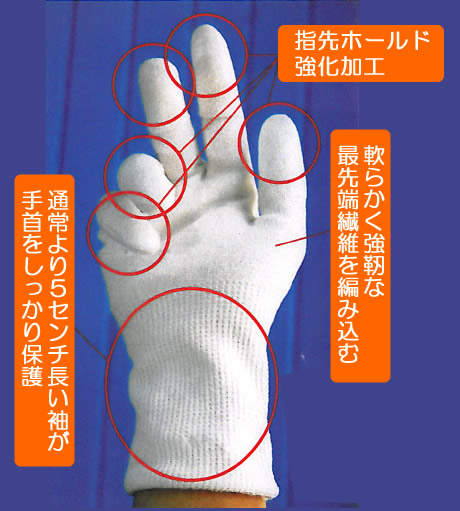 この世界最先端の新素材は、警察官及び軍用ヘルメット、防弾・防刃ベスト、車両および航空機の防弾装備、海洋ロープ、商用魚網、工業用ロープ、帆、つり糸、その他レジャー用品等に無限の使用可能性を持った繊維であり、耐切創性手袋として開発されたのが、このグローブです。