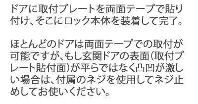 | 扉やカベに穴をあけずに防犯、賃貸住宅にも最適! 付けたままだから相手に対して在宅・不在の判別がつかない! 今まで取り付けできなかったタイプのドアにも対応できるようになりました! アンチピッキングピン採用のキー違い200万通りで、簡単に1ドア2ロックが可能です! 取り付けも、工具不要で簡単に取り付けができます。 サムターン廻しや、ピッキング、カム送り不正解錠対策に・・・ |