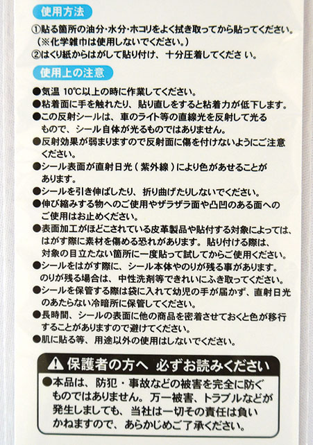 • 反射シールは車やバイク、自転車等のライトを反射して光ります。