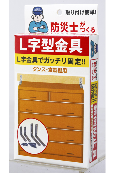 • 頑丈な焼付塗装した鉄製の金具とネジで、タンスや食器棚などの木製家具をガッチリ壁に固定して転倒を防止します。