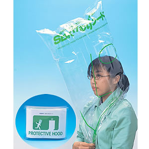 空気を入れ、かぶるだけで走って約3分間、歩いて約5分間、呼吸ができるので、火災時の煙から身を守り、目を開けたまま非難することができます。