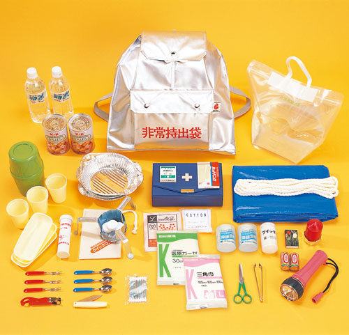 ・非常用持出袋D(表面加工/アルミ粉末入り合成ゴム) ・非常用給水袋(4L) ・缶入カンパン(110g×2缶) ・スーパー保存水(500ml×2本) ・防水ライト(試用電池付) ・非常用ローソク(マッチ付) ・万能シート(1800×1800mm) ・クイックコンロ(携帯袋・燃料付) ・アルミ箔ナベ(3個) ・3人用食器セット ・ロープ(5m) ・救急セットB |