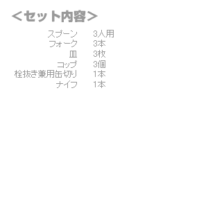 ここは空白です 3人用の食器と栓抜き、缶切りがコップ兼用容器に入っています。