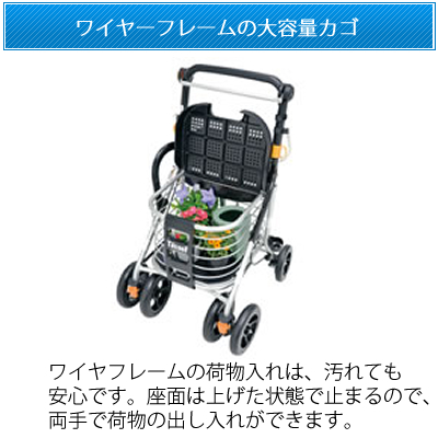| ワイヤフレームの荷物入れは、汚れても安心です。座面は上げた状態で止まるので、両手で荷物の出し入れができます。 |