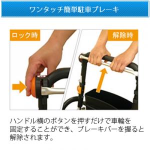 | ハンドル横のボタンを押すだけで車輪を固定することができ、ブレーキバーを握ると解除されます。 |