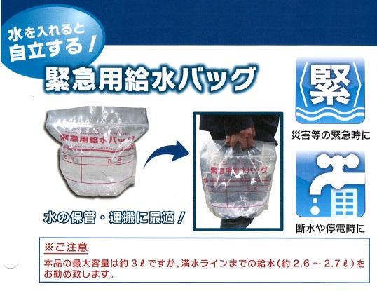 - 災害等の緊急時、断水や停電時に活躍する給水バッグです。レジャーでも使えます。