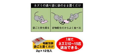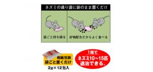 - ネズミの出入りする場所の物陰に、本品2〜10gを3〜5ヵ所に配置してください。