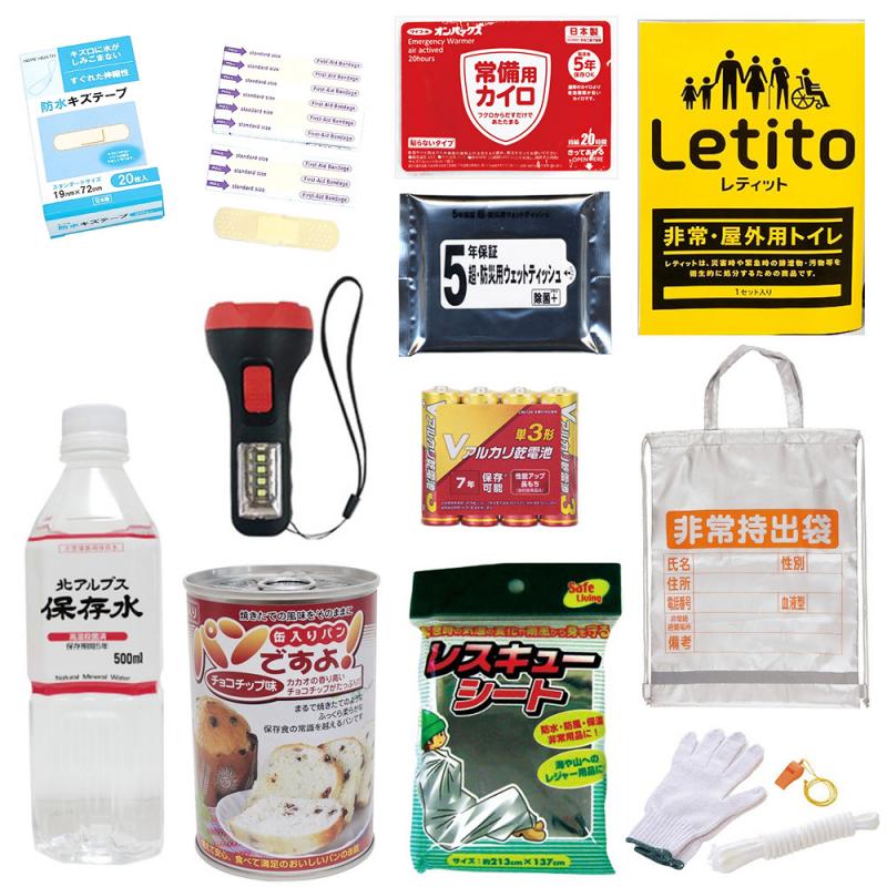 内容 非常用持出袋×1枚、レスキューシート×1枚、ウェットティッシュ×1袋、軍手/ロープ/笛×1セット、カイロ×1枚、絆創膏×1箱、非常・屋外用トイレ(1枚入)×1個、LEDライト×1本、単3形乾電池(4本)×1組、保存水(500ml)×1本、パンの缶詰(チョコチップ)×1缶