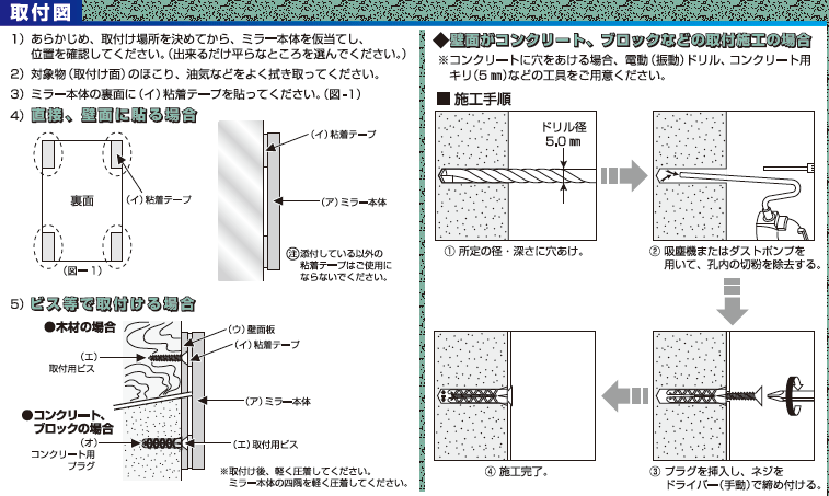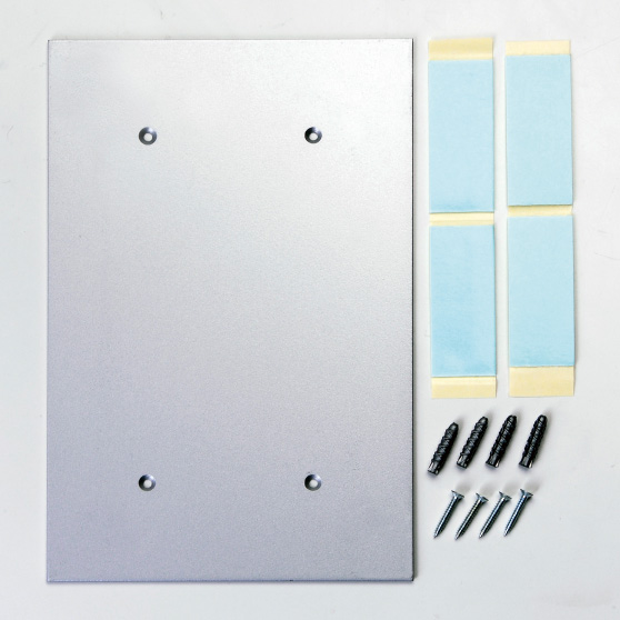 付属品 粘着テープ(4枚)、ビス止め用壁画板(1枚)、取付用ビス(4ケ)、コンクリート用プラグ(4ケ)