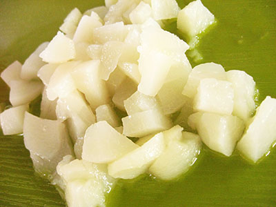 大きめに切って、シラップに温めたゼラチンを加えれば、