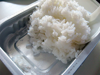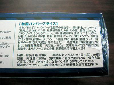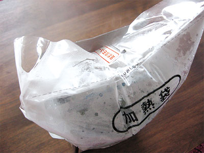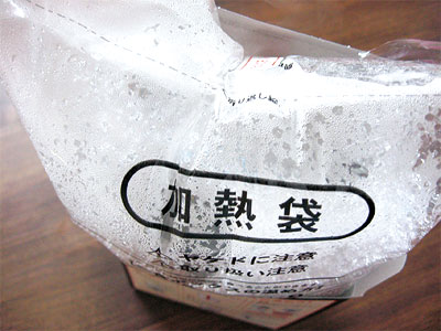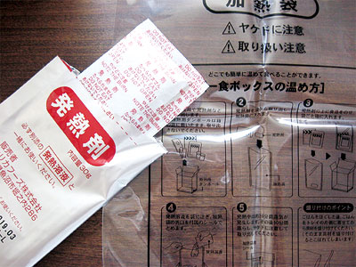 加熱袋の底に発熱剤を敷いて、「白いごはん」と「和風ハンバーグ」を入れます。