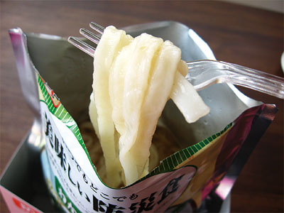お湯を注ぐ前のうどんはこんな感じ。 口に入れて見たけれど、、、硬くて食べられませんでした。