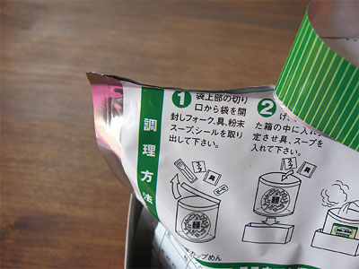 袋の中には、麺、フォーク、具、スープ、封をする為のシールが入っています。