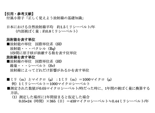 という疑問や、計測した値がどの程度のものなのかなど、放射線に関する事が、分かりやすく記載されているので、測定前に読むとより理解が深まります。