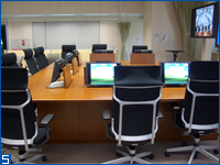 大型モニターを正面にコの字型にいすが配置され、会議用のテーブルには一人1台ずつ小形モニターが内蔵されています。