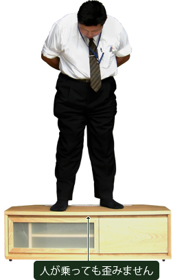 左の写真でTVボードの上に乗ってる人の体重は実は110kgあります。でも、天板もほとんど歪むこともなく、ミシミシ音が鳴ることもありませんでした。